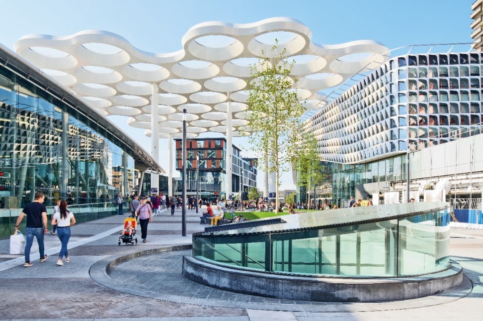 Così è iniziata la trasformazione: la vecchia Stationsstraat è diventata “Stationsallee”, una strada pedonale con una dolce curva che guida il percorso verso la nuova stazione ferroviaria. Le scale portano al livello superiore, dove la strada si apre a una nuova piazza pubblica sopraelevata, che introduce agli ingressi della stazione e del centro commerciale. La piazza è spaziosa e ariosa. Comprende terrazze, verde pubblico e una fontana circolare che si propone come il punto d’incontro per i passanti e la cui forma riprende le curve che si notano ovunque si guardi.