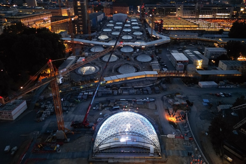 Oltre al forte impatto scultoreo, il tetto funziona come sistema climatico intelligente. Dal lato del parco i calici inspirano aria fresca, che si riscalda e sale attraverso le cupole, creando un flusso naturale continuo. Questo processo passivo, supportato dallo scambio geotermico sotto i binari, mantiene le temperature costanti durante tutta la giornata. Pannelli fotovoltaici lungo il perimetro del tetto e sulle facciate generano energia rinnovabile, mentre pozzi e sistemi radianti garantiscono il comfort all’interno. Le cupole fungono contemporaneamente da lucernari e torri di ventilazione, consentendo alla hall di non ricorrere a raffreddamento meccanico o luce artificiale durante il giorno.