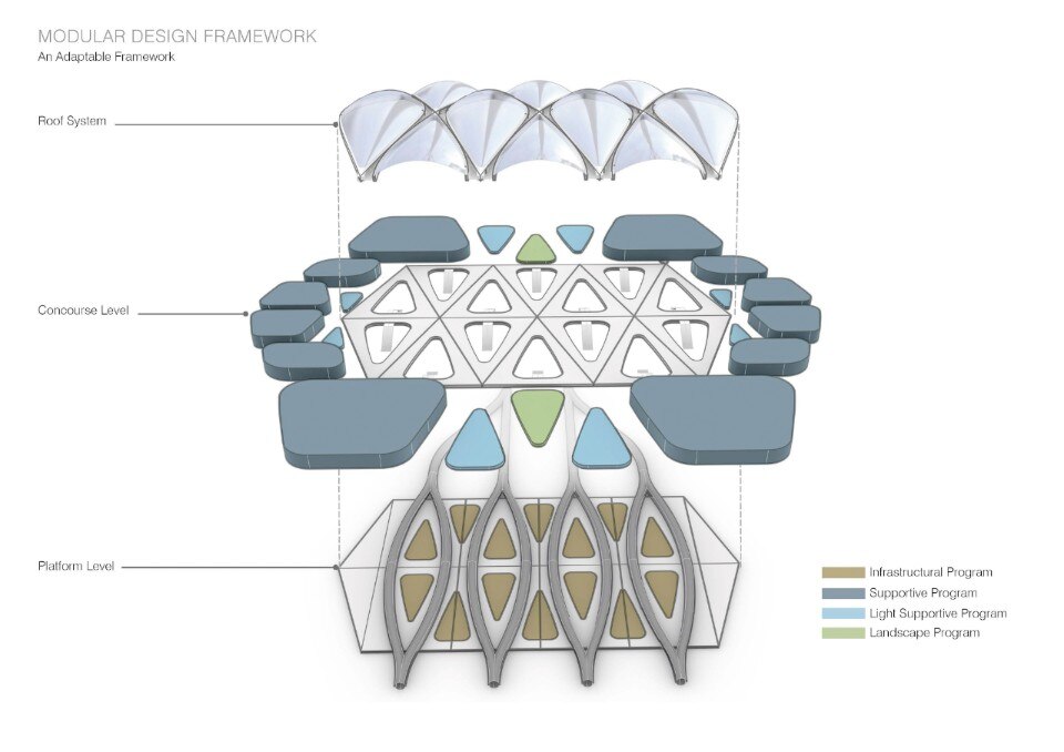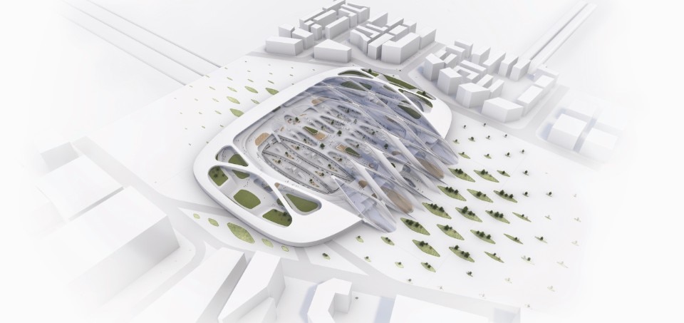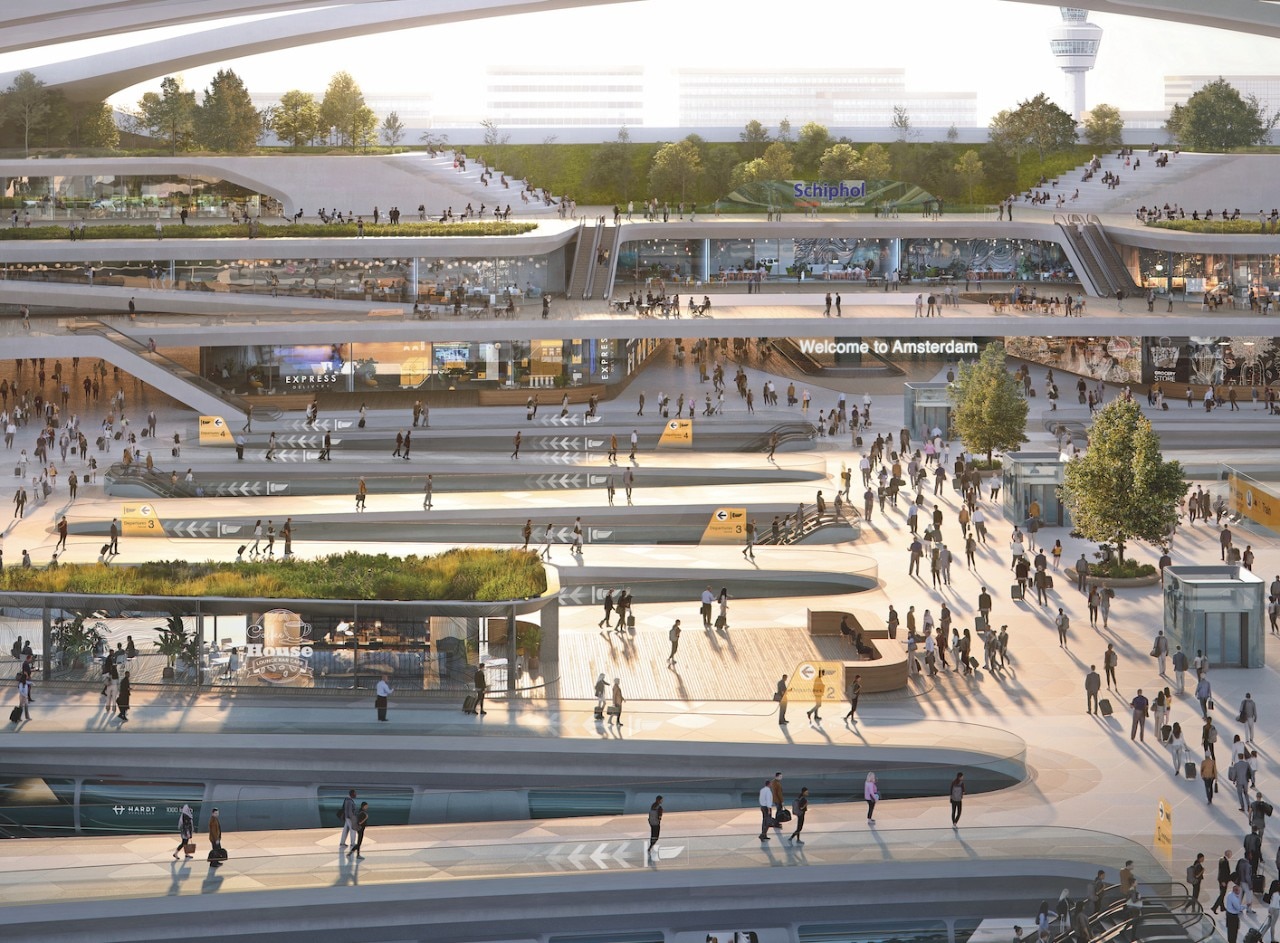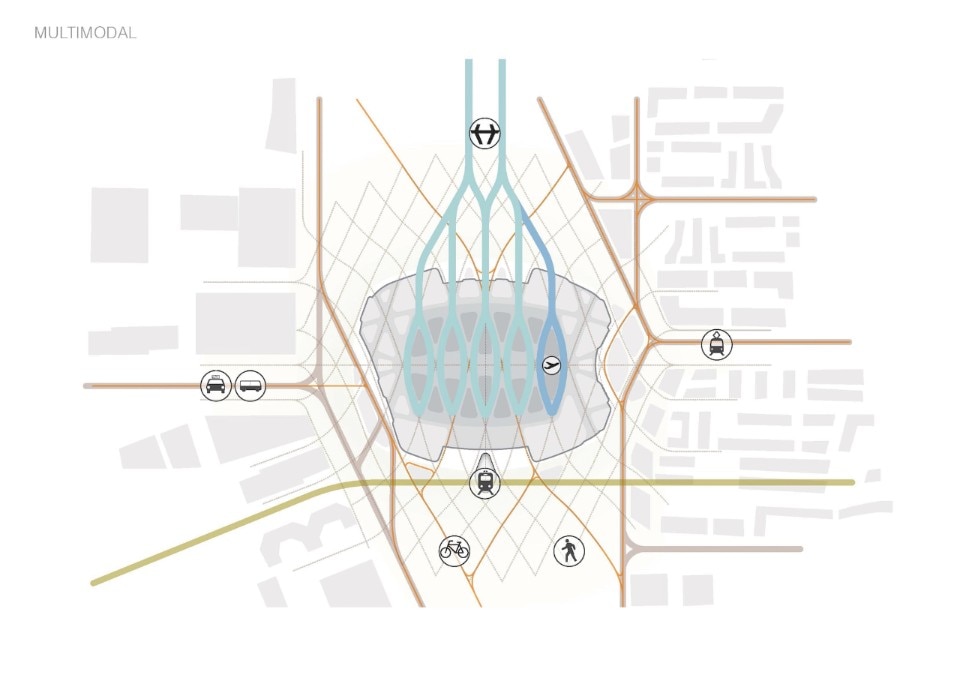 UNStudio ritiene che questo possa determinare un allontanamento dalla dipendenza dalle centrali elettriche per passare a un immagazzinamento dell’energia che si collega a microreti locali. L’energia in eccedenza prodotta negli hub di trasferimento o intermodali e lungo i tubi dell’Hyperloop alimenterebbe i veicoli autonomi, gli autobus e le biciclette di cui i passeggeri potranno servirsi per completare il loro viaggio. La stazione diventa allora una batteria che regola il sistema alimentato a energia solare, oltre a regolare il suo ambiente interno attraverso materiali ad alte prestazioni che reagiscono al cambiamento dei livelli di calore, luce e umidità. «Se la ferrovia ad alta velocità ha offerto un’alternativa gradita e comoda al viaggio su lunga distanza tra città, non è mai stata un’alternativa percorribile a livello transnazionale. Come è invece l’hyperloop», dice Arjan Dingsté, direttore e senior architect di UNStudio. «E integrando le sue stazioni come hub di trasferimento a uso misto nelle nostre città, saremo in grado di garantire un’accessibilità rapida al centro, nonché di creare collegamenti con altre forme di trasporto pubblico sostenibile e offrire un trasporto innovativo per l’ultimo tratto del viaggio (last mile)».