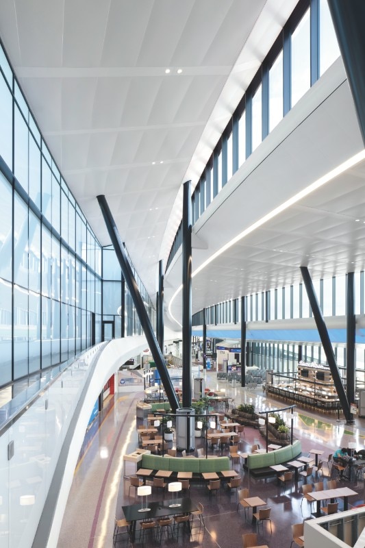 Il Terminal E riflette l’impegno verso la sostenibilità e la resilienza, tracciando un percorso verso l’azzeramento delle emissioni e adottando caratteristiche progettuali che sono in linea con la certificazione Leed Gold. Con il supporto dei nostri partner per la sostenibilità di Thornton Tomasetti e Arora Engineers, il team di progettazione di Aecom ha utilizzato strumenti di modellazione per valutare il terminal e migliorare la gestione delle emissioni di carbonio nonché l’uso dell’energia. La modellazione ha anche aiutato il team a determinare la forma dell’edificio al fine di sfruttare al massimo la luce solare, immagazzinare la luce del giorno durante tutto l’anno e generare energia con il fotovoltaico integrato nell’edificio. Inoltre, la combinazione di un involucro altamente efficiente con una strategia olistica di riscaldamento e raffreddamento sarà in grado di ridurre il consumo e l’impronta energetica operativa.