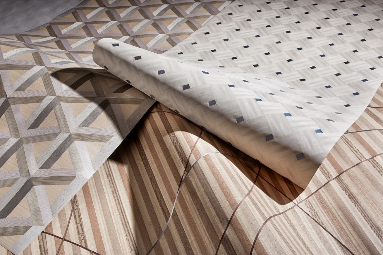La collezione è suddivisa in due grandi gruppi. Il primo è quello dei Graffiti, ossia tutti prodotti che vengono realizzati tramite intarsi industriali con diverse specie legnose. Quindi abbiamo la famiglia dei multilaminari di ultima generazione, legni dove previa incollatura di lamine sottili tinte singolarmente è possibile creare geometrie e disegni controllati. Ne è un esempio City Vibes, un prodotto ad “effetto barcode” per la scelta cromatica del bianco e del nero. A questi si aggiunge la linea dei piallacci naturali, dove invece la venatura è controllata da madre natura.