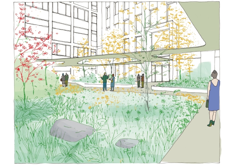 Immagine di apertura: nel render di Piuarch, la vista dall’alto del complesso consente di leggere l’alternanza di volumi pieni e vuoti e i percorsi di attraversamento che connettono la sede alla città. Courtesy of Piuarch