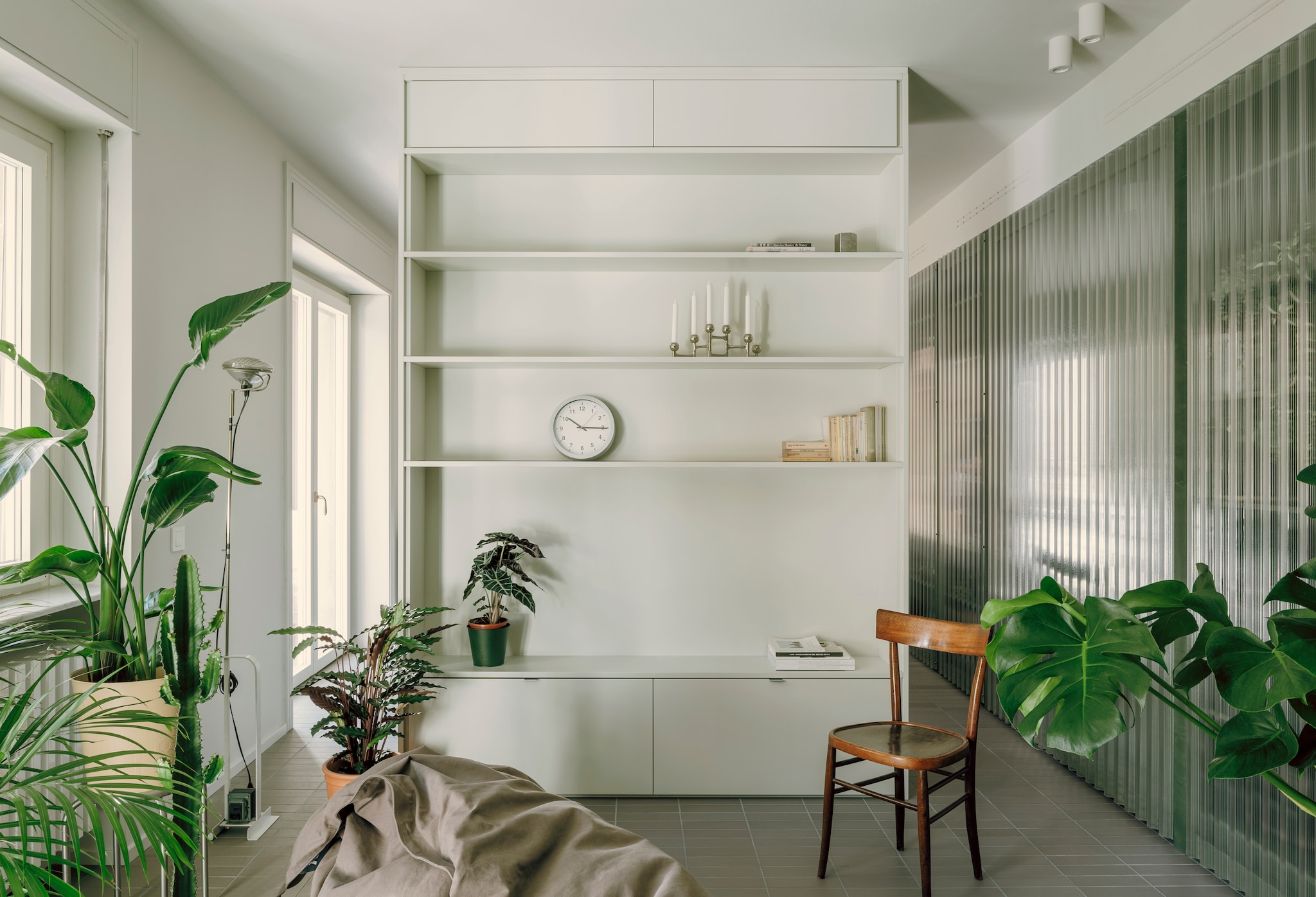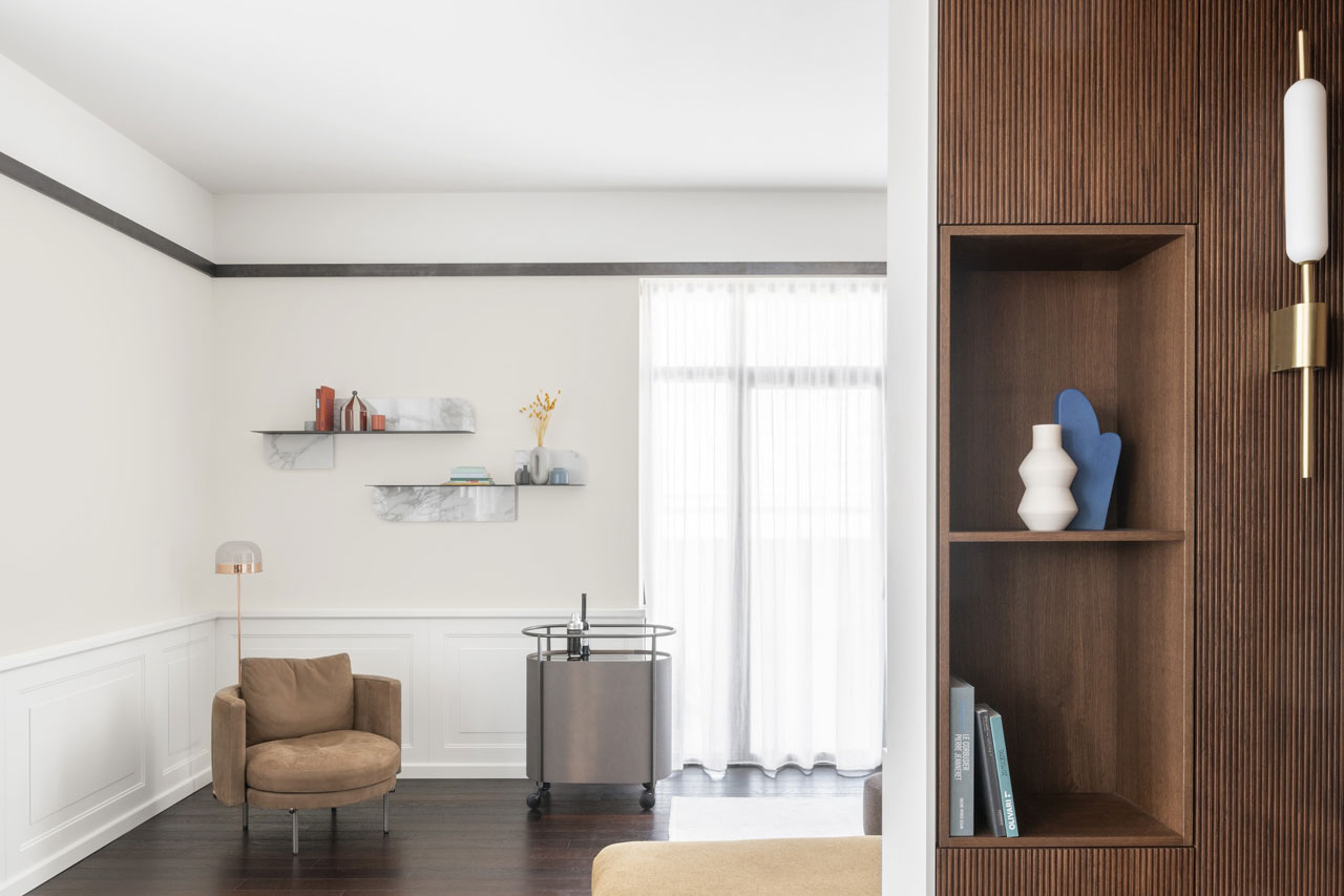 Oggi, la boiserie si sposa ad un’idea di casa calda e vestita. Può essere utilizzata secondo un approccio molto classico come una rifinitura elegante e discreta, come accade nell’appartamento progettato da Plus Ultra a Milano, dove il pannello con cornici a mezza altezza, finito in bianco, convive con una boiserie scanalata a tutta altezza che lascia il legno al vivo, creando un contrasto tra tradizione e contemporaneità. In maniera quasi controintuitiva, la boiserie può anche svecchiare: è l’ottimo esempio dell’appartamento progettato da MH.AP a Barcellona, che usa la boiserie cannettata come un filo rosso tra le stanze in grado di far respirare stucchi e vecchie cementine.