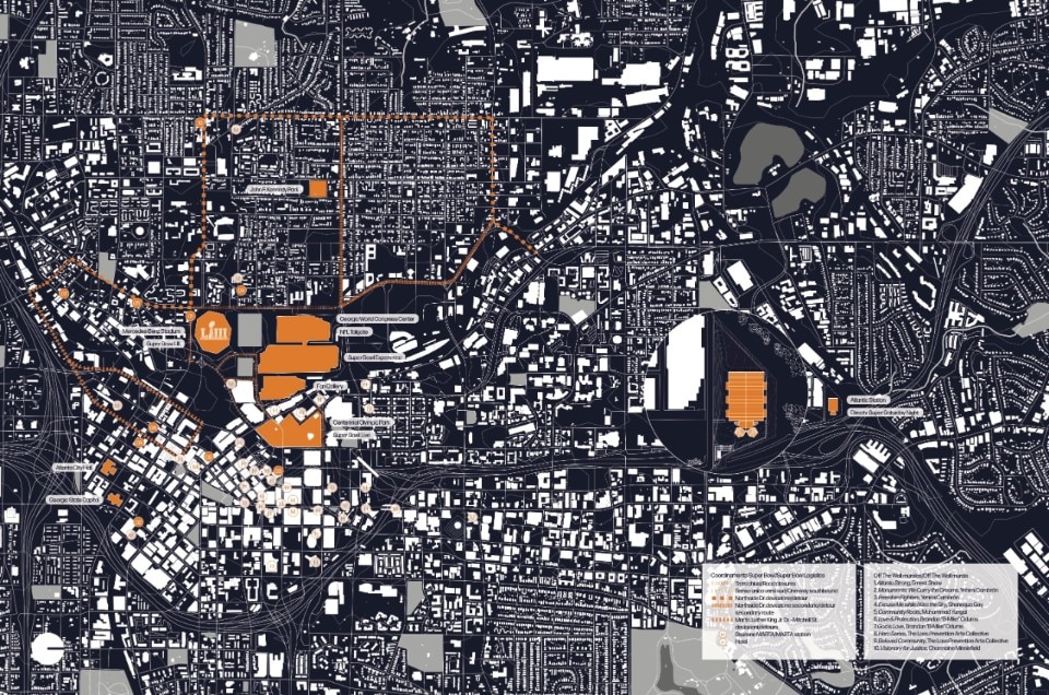 Durante le settimane che precedono il Big Game, la città che lo ospita trasforma il suo aspetto e rompe i paradigmi delle sue dinamiche quotidiane. Una ‘città’ effimera s’insinua nel tessuto urbano, con strutture provvisorie costruite sia nell’area attorno allo stadio ‒ cuore pulsante dell’evento ‒ sia nelle vie del centro. Com’è facile aspettarsi, una miriade di padiglioni televisivi e infrastrutture accessorie fanno poi da cornice alle articolate operazioni del Super Bowl.