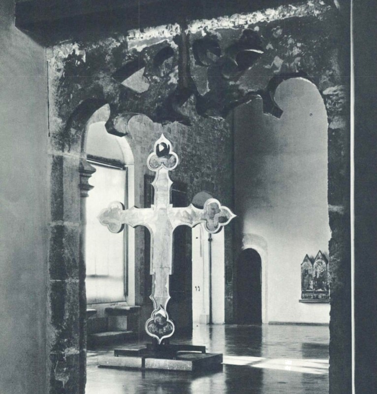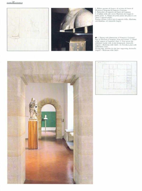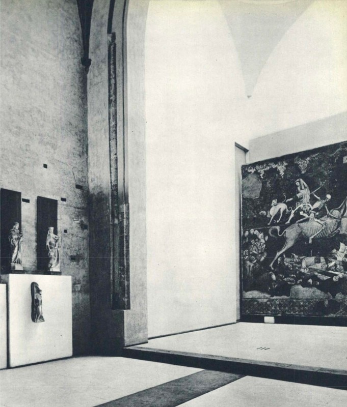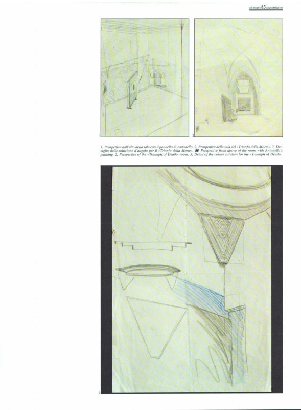 Il “ritocco” architettonico di Scarpa al consistente restauro eseguito nel dopoguerra dai soprintendenti Mario Guiotto e Armando Dillon si limita a pochi ma significativi interventi circoscritti. Il maestro veneziano non resiste al fascino della calda pietra d’Aspra e riprende in stile le parti mancanti di alcuni ornamenti originari, in special modo dei riporti esterni degli scalini a maglie ortogonali intrecciate. […] Nel disegno degli arredi dei supporti espositivi, Carlo Scarpa si rivela raffinato epigono di una lunga tradizione mittel-europea di arti applicate, di una studiatissima produzione di piccola serie, e mai destinata ab origine all’industria o all’iterazione in genere. […]