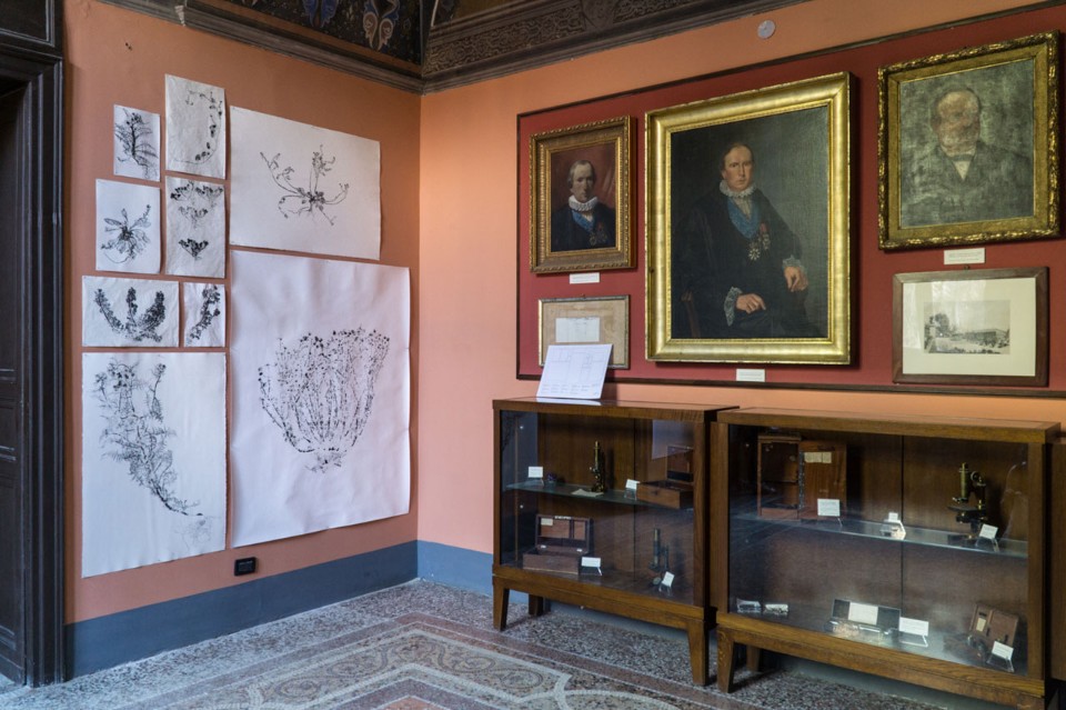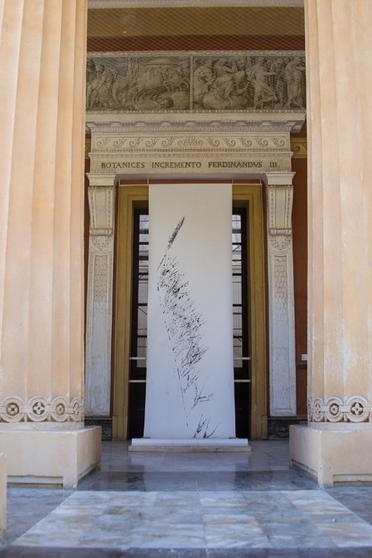 Alla scienza si rifà l’opera di Malin Frazén (“Palermo Herbal”) che si occupa di come le piante vengano rappresentate visivamente dall’uomo a fini di studio: un video all’interno del Ginnasio mostra i diagrammi utilizzati per visualizzare la profumazione dei vegetali, piuttosto che le immagini di studi microcellulari. Fulcro principale del progetto sono però i disegni e le lunghe tele/stendardo in cui la raffigurazione delle piante trovate in città dall’artista è stata realizzata attraverso la tecnica messa a punto da Paolo Boccone, botanico siciliano che nell’intento di trovare un modo più oggettivo (e quindi scientifico) per raffigurare i vegetali usava colorarli, pressarli e imprimerli direttamente su carta.