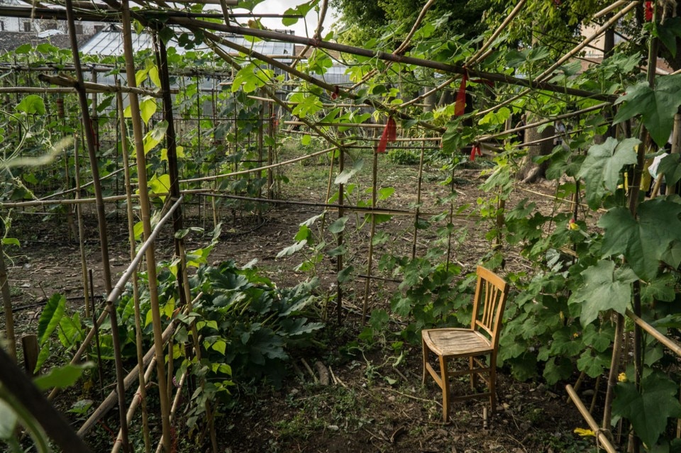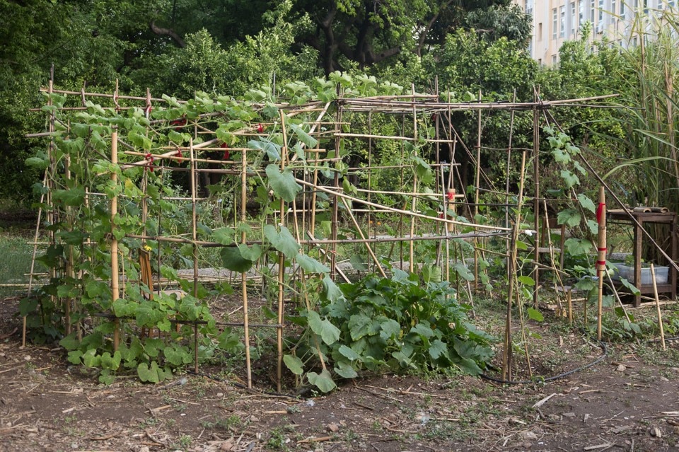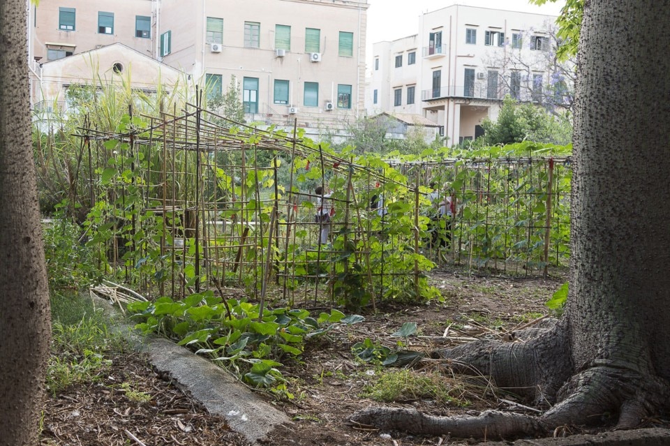 Il lavoro di Leone Contini (Foreign Farmers) va nella direzione della ricerca antropologica sul campo portando con sé l’idea della convivenza di colture/culture. Si tratta di uno studio sulle sementi che arrivano in Italia attraverso le migrazioni dei popoli che le portano con sé dalle proprie terre d’origine e le coltivano per cibarsene. A Palermo l’artista pianta un orto con pergolato nel quale la cucuzza siciliana si avviticchia naturalmente con altre specie di zucca coltivati da agricoltori migranti in altre zone d’Italia. Oltre all’orto poi, nelle teche del ginnasio sono esposti i semi collezionati dall’artista in questi anni di ricerca.