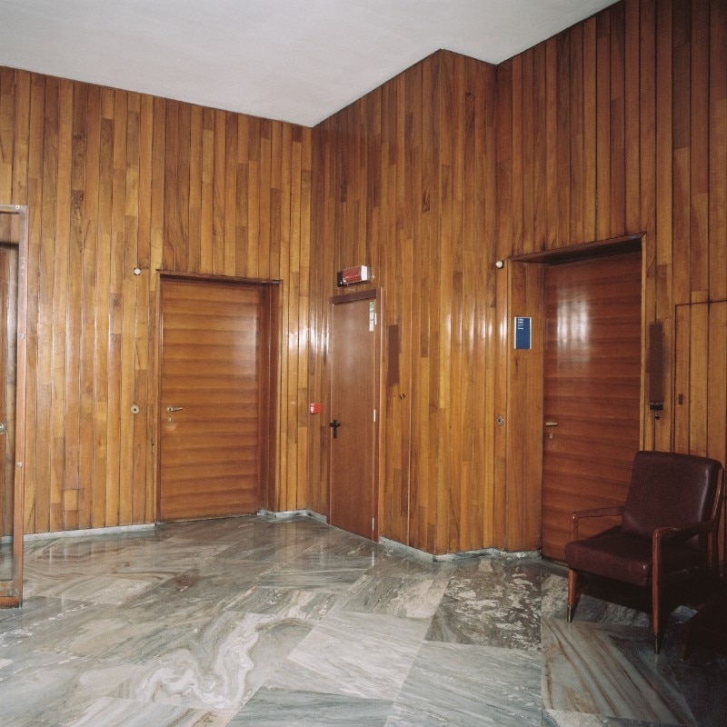 Eppure, percorrendolo, ci si stupisce del livello di originalità di moltissimi particolari, squisitamente pontiani: il vano scale principale, rivestito in ceramica, traforato da grandi oblò e percorso dall’inedito corrimano continuo, che cambia direzione senza interrompersi; frammenti sparsi sia integrati, come porte, maniglie, interruttori o appliques, sia mobili, siano essi sedie, tavoli o scaffali; interi ambienti conservati, soprattutto l’ufficio del direttore, anch’esso cristallizzato in un raffinatissimo secondo Novecento di legno, marmo ed opere d’arte. Perché ripensare al Centro produzione Rai di corso Sempione, oggi? La storia dell’edificio conoscerà presto un importante momento di discontinuità.