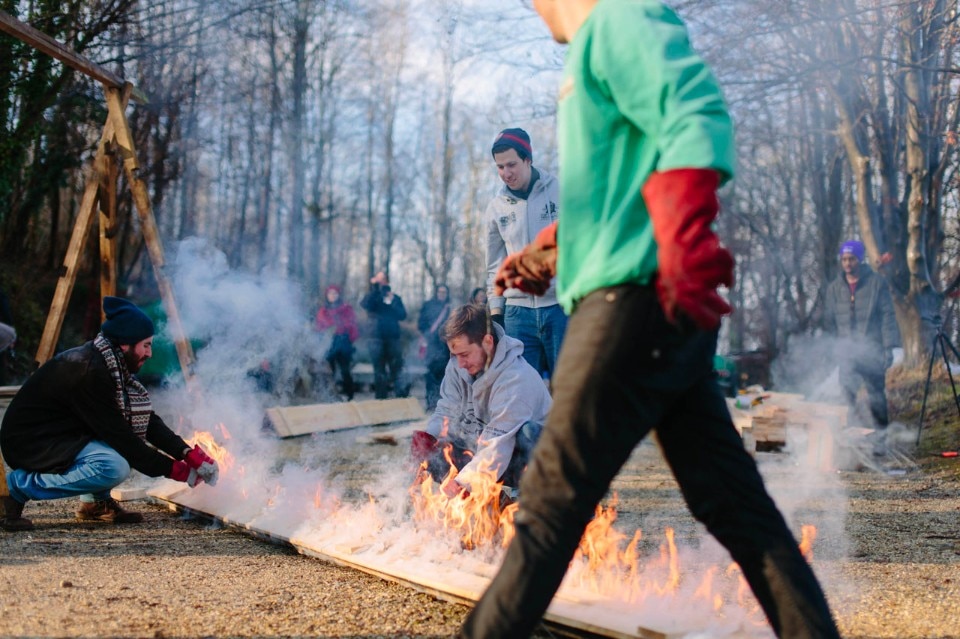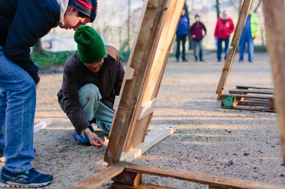 Fujimori è convinto che gli edifici possano essere realizzati da persone non specializzate, e la Tea House segue questo principio: infatti, è stata costruita dagli studenti e dai tutor della Kingston University sotto la guida dell’architetto giapponese Takeshi Hayatsu. Il rivestimento esterno utilizza il Yakisugi, un legname carbonizzato prodotto utilizzando la tradizionale tecnica di carbonizzazione giapponese. Il laboratorio per la realizzazione di questo materiale è stato tenuto al Weald and Downland living museum nel West Sussex nel gennaio 2017. La struttura è stata prefabbricata nei laboratori dell’Università. Le maniglie in bronzo, i lampadari in ceramica, il focolare, il vaso e gli sgabelli in compensato sono stati realizzati a mano dagli studenti della Kingston, all’interno dei corsi di design del prodotto e di mobili.